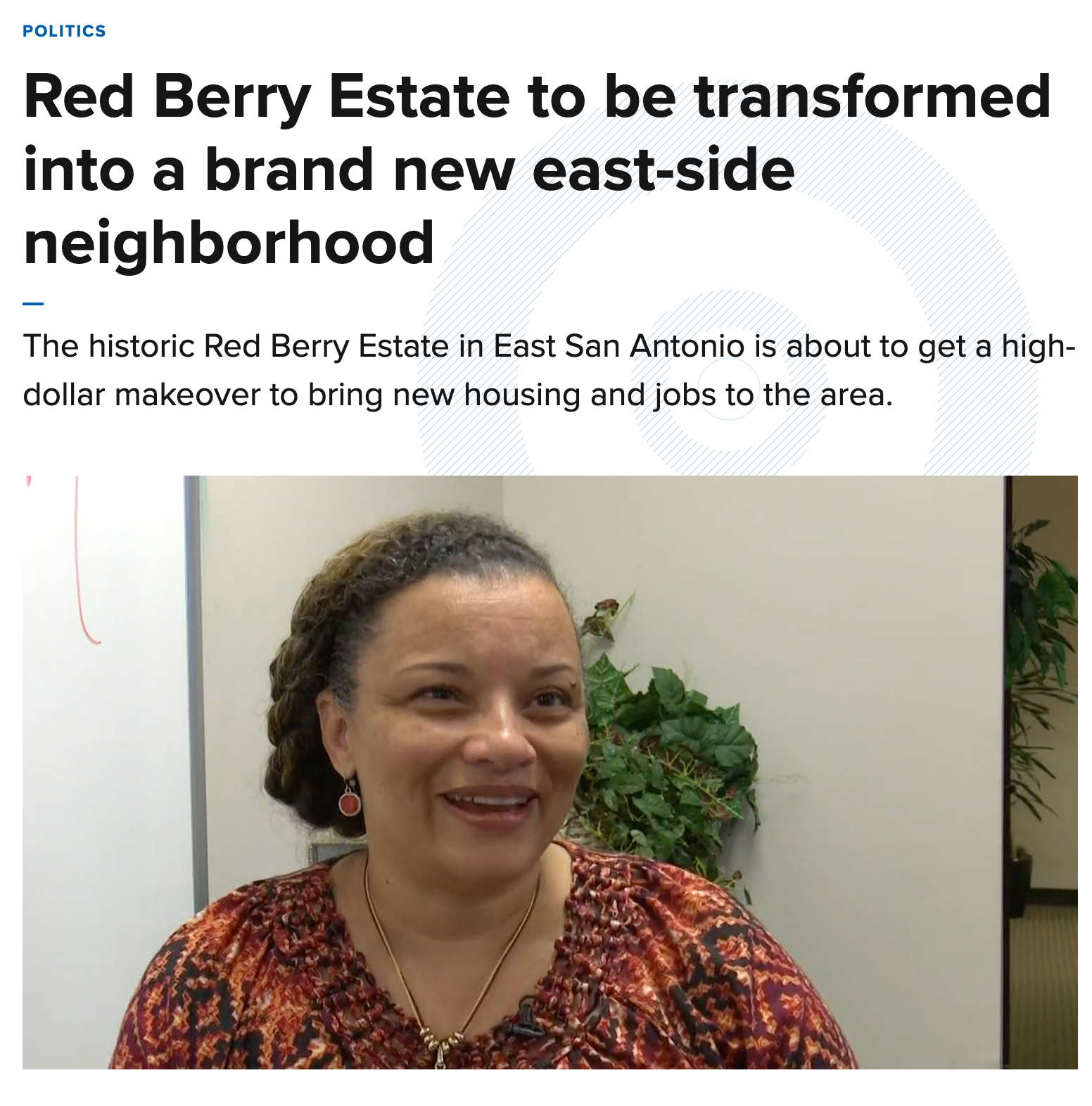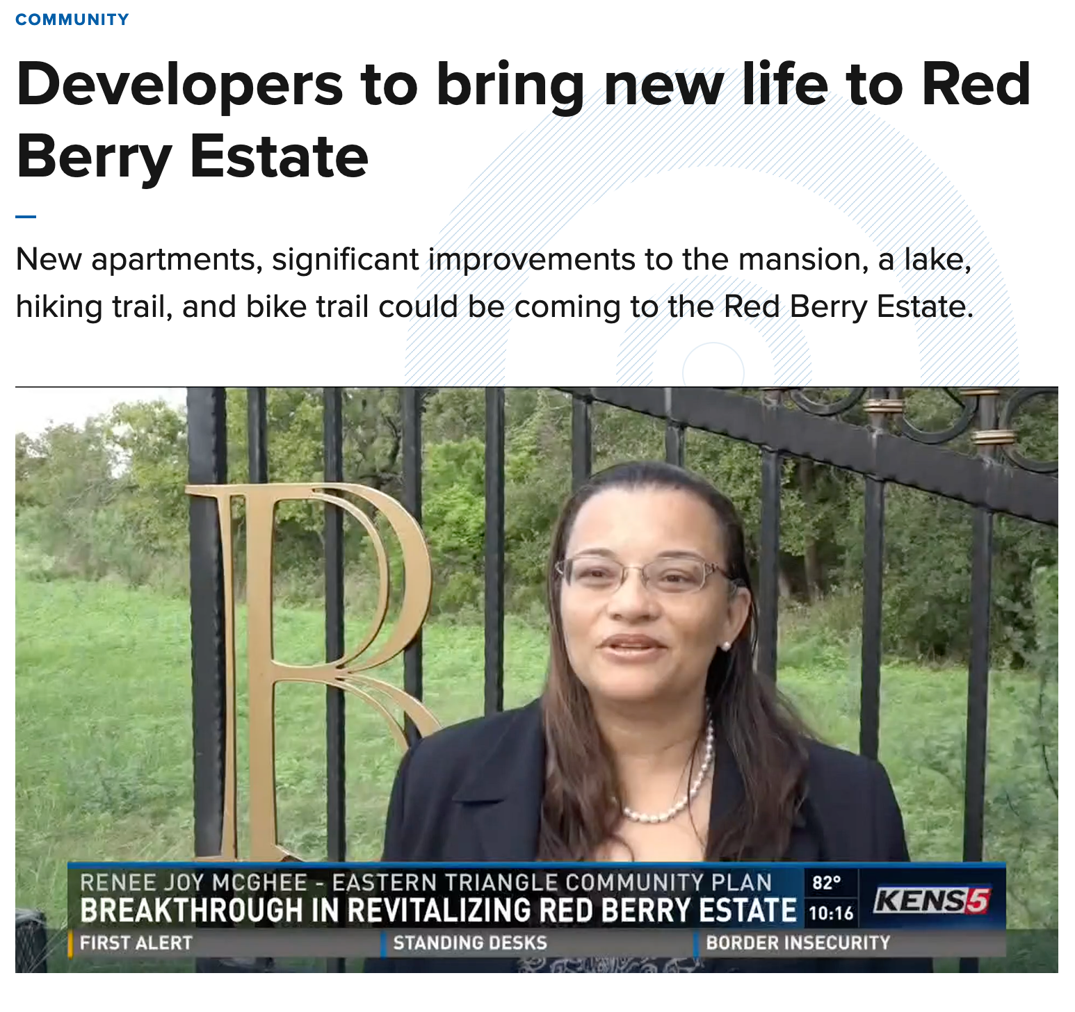 Watch NowThis news report discusses the redevelopment of the Red Berry Estate, a significant project aimed at revitalizing the East Side of San Antonio. R. Joy McGhee's involvement in the Eastern Triangle Community Plan emphasizes her commitment to community enhancement and economic growth.